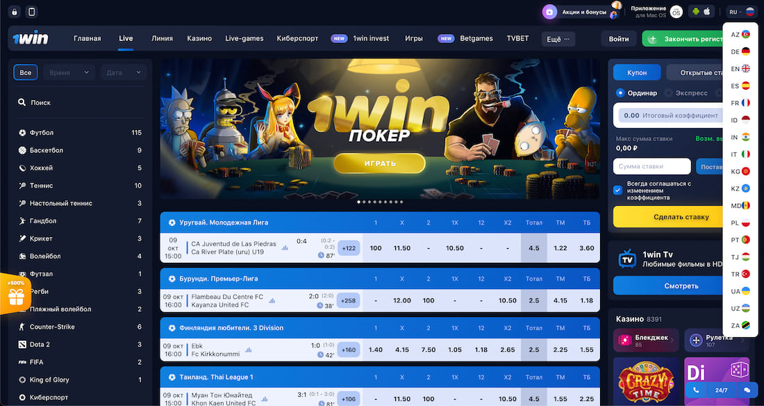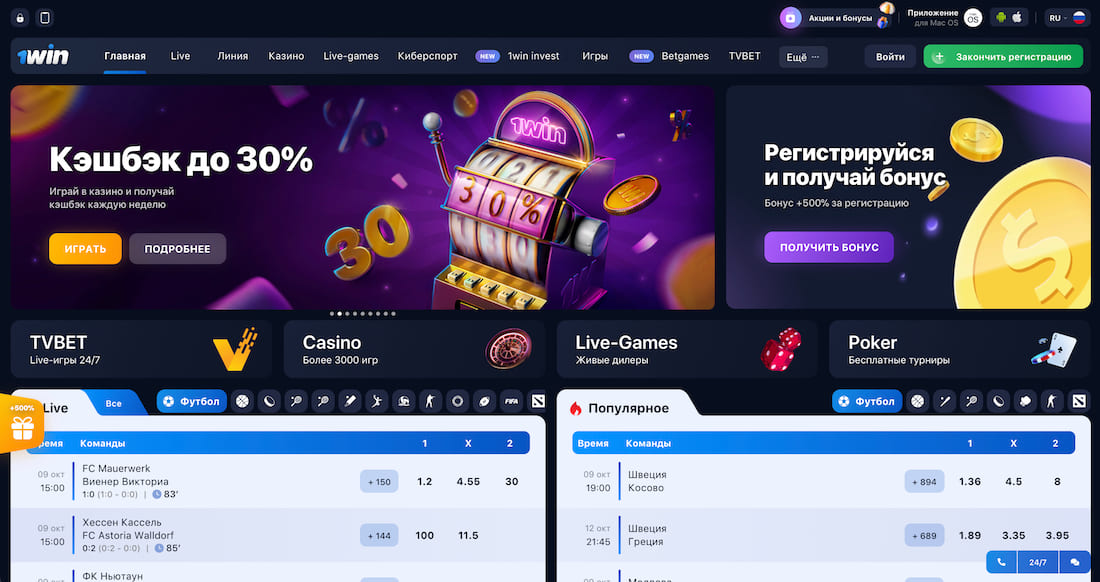 1Вин – это лицензированная букмекерская контора. Здесь можно делать ставки на спорт или киберспорт. Кроме этого, на сайте множество азартных развлечений онлайн: